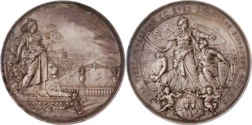 AR medaile na sjednocení Budy a Pešti 2.IX.1886 - Panonie, lev a pohled na město / alegorie na osvoboz. Budína, opis, Sign., Ag 73mm, 120.200g, vl.škr., pat.