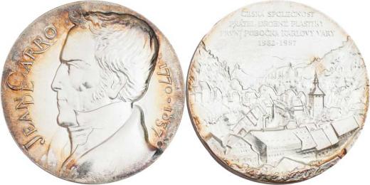 Karlovy Vary - 5.výročí založení pob. ČSPDP 1987 - poprsí Jeana de Carro, zakl.lázní, opis / pohled na město, nápis, Sign., Punc.Ag900, 60mm, 115.603g, etue