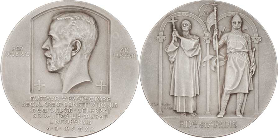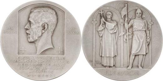 Gustav V. - 100.výročí ústavy 1920 - hlava zleva, dva kříže, 8-řádkový nápis / kněz a rytíř, nápis, Sign.E.Lindberg, patinované Ag 57mm, 87.146g