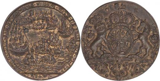 Admirál Vernon - na dobytí přístavu Porto Bello 1739 - lodě v přístavu, opis / královský znak a monogram, Sign.IW, bronz 38mm, 14.695g, prohnutá, pěkná pat. R!