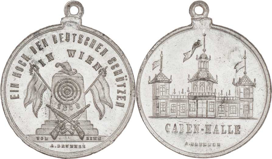 Vídeň 1868 - III.německé spolk. střelby - střelnice, nápis/ terč, prapory, pušky, dva opisy, Sign.Brunner, cín 33 mm s původním raženým ouškem, nep.rysky