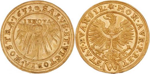 Dukát 1635, Vratislav-Rieger, MKČ.1144, podobný jako ČS.622, Sa.17 (obr.6), 3.468g, mírně zvlněný, nep.úhoz, téměř RR!