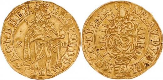 Dukát 1692 KB, Kremnica, Nech.1042, Husz.1321, 3.476g, zvlněný, nep.nedor., nep.úhoz, pěkná patina, téměř