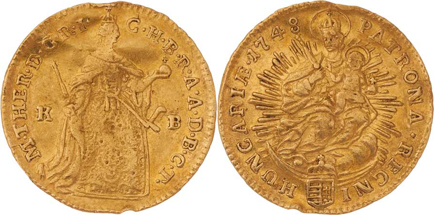 Dukát 1748 KB, Kremnica, N.71, Husz.1652, 3.452g, dr.stopy po zasazení, mírně zvlněný, vlas.rysky