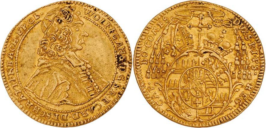 Dukát b.l. - poprsí zpava, opis / korunovaný znak pod kardinálským kloboukem, opis, S-V.777 (B/B), 3.470g, skvrnka, pěkná patina, téměř RR!