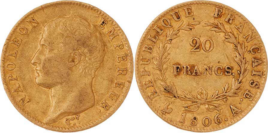 20 Frank 1806 A, Paříž, KM.674.1 (Au900), 6.409g, dr.hr., dr.rysky, pěkná patina