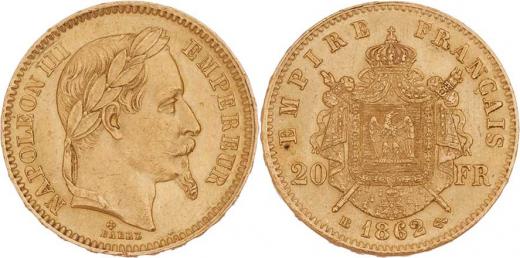 20 Frank 1862 BB, Strasbourg, KM.801.2 (Au900), 6.443g, nep.hr., nep.rysky, téměř