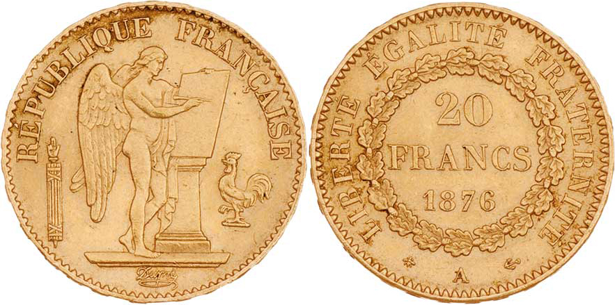 20 Frank 1876 A, KM.825 (Au900), 6.439g, nep.hr., nep.rysky, téměř