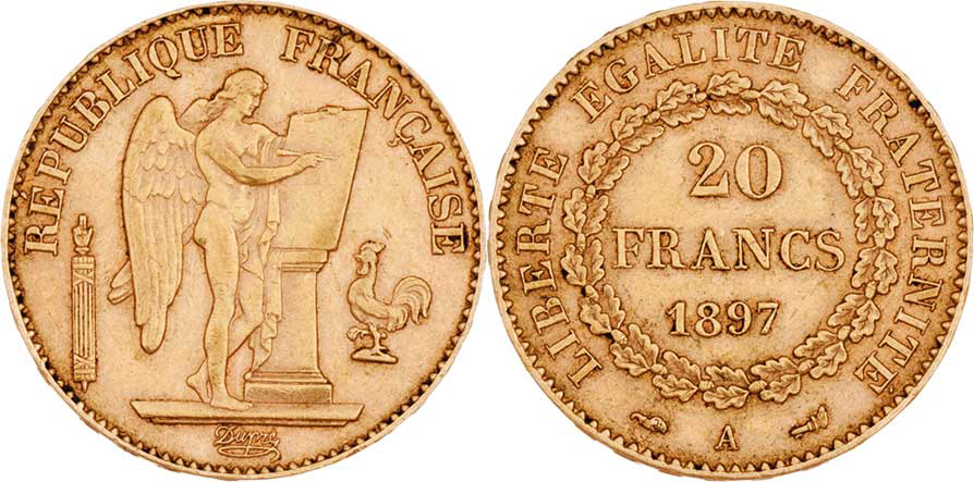 20 Frank 1897 A, KM.825 (Au900), 6.438g, nep.hr., nep.rysky, pěkná patina