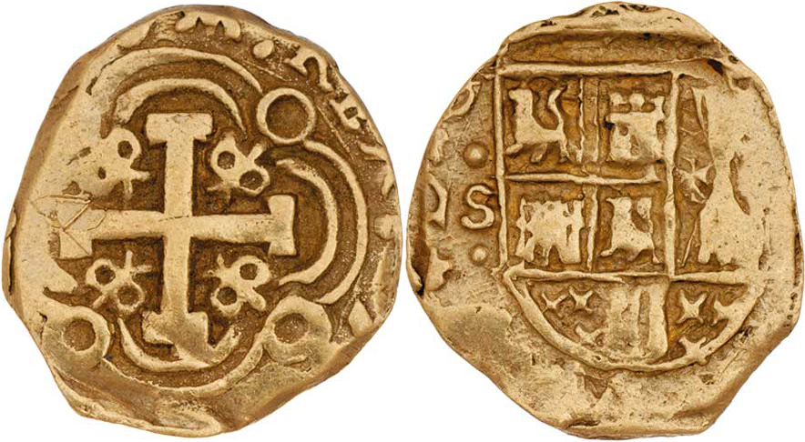2 Escudos - lodní peníz bez letopočtu a značky minc., podobný jako Fr.3 (Kolumbie), 6.686g, nepravidelný tvar střížku, nedor., patina RR!