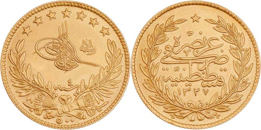 500 Piastr AH.1327, 4.rok vlády = 1912, KM.758 (Au917, pouze 41.863 ks), 35.995g R!