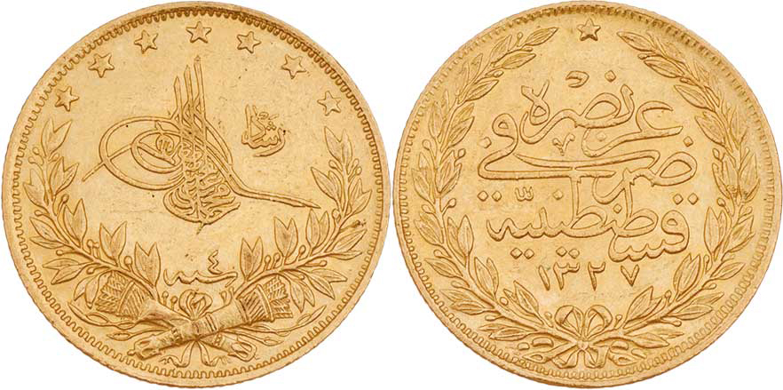 100 Piastr, AH.1327, 4.rok vlády = 1912, KM.754, (Au917), 7.193g, nep.hr., nep.rysky, téměř