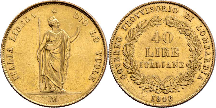 40 Lira 1848 M - stojící Italie, italský opis / nápis ve věnci a opis, Cr.24 (raženo pouze 5875 ks), 12.702g, opravená hrana, dr.rysky RR!