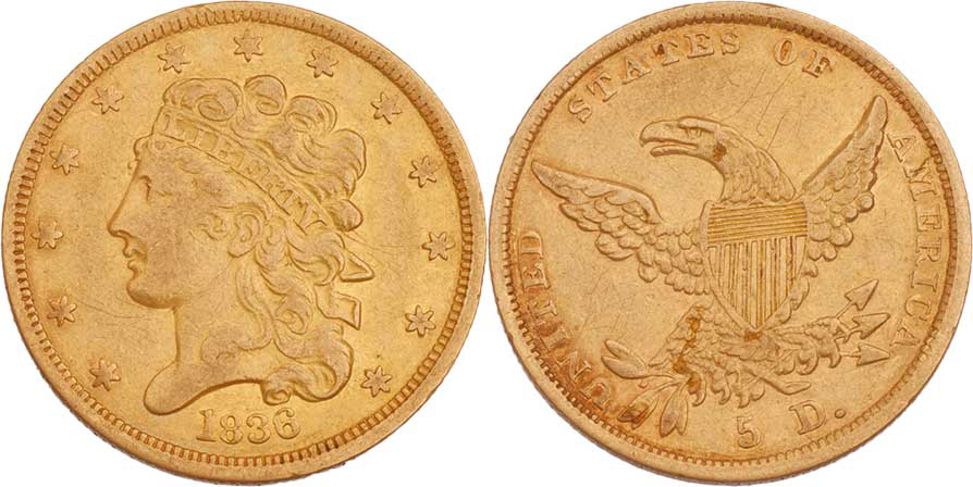 5 Dolar 1836 - hlava Liberty, KM.57 (Au900), 8.283g, nep.hr., nep.rysky, pěkná patina R!