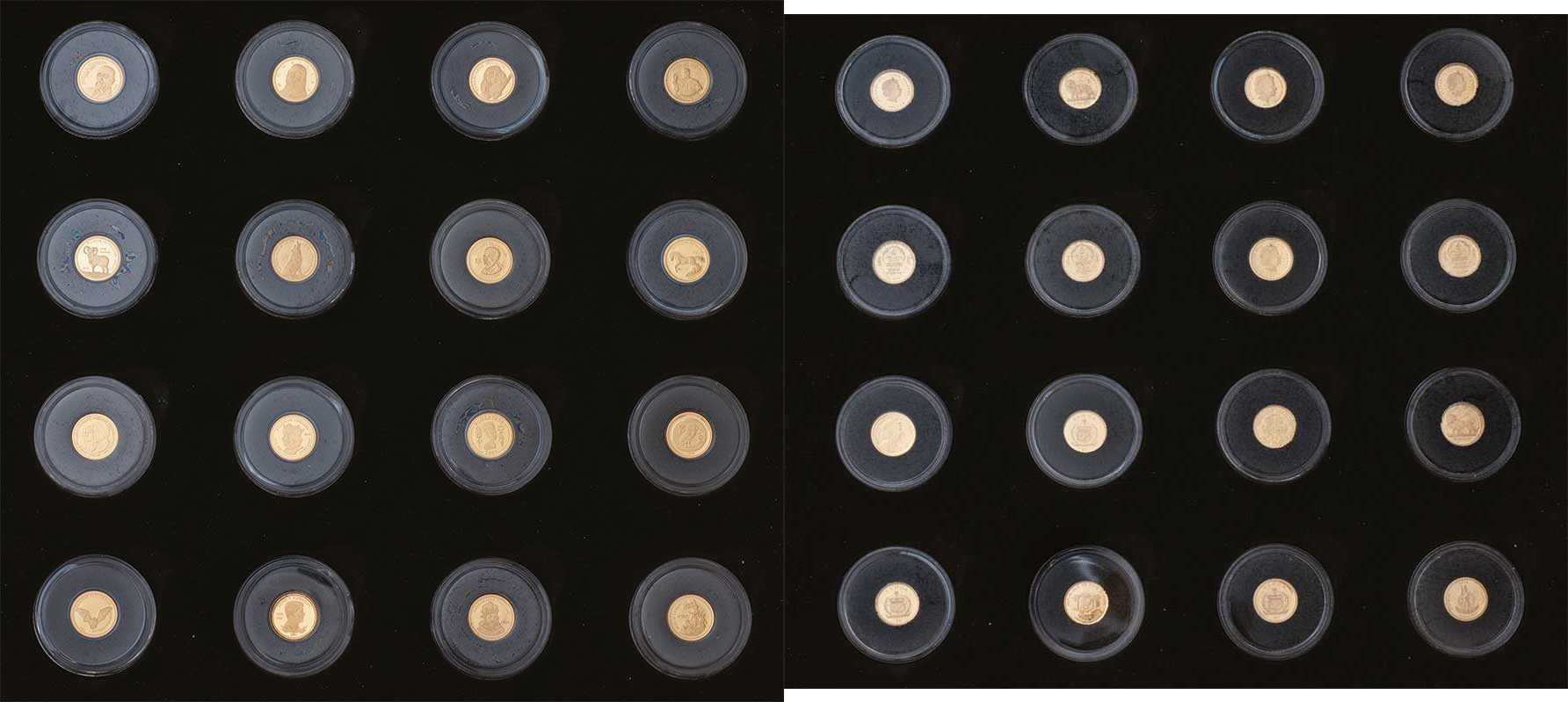 Série Nejmenší zlaté mince světa - 16ks, Au999, 0.50g, 16x kapsle, 16x "certifikát", 1x dřevěná etue