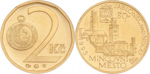 Dostál, Truhlíková - mincovní město Jablonec 1995 - významné budovy, znak, písmo/ replika Rv. dvoukoruny, Au999, 20mm, 7.790g, kapsle