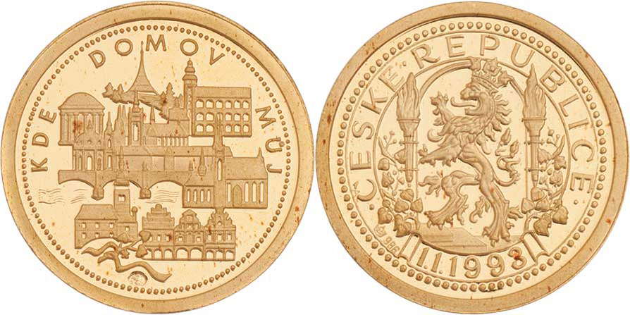 Dukát 1993 - stavební památky českých měst, opis / český lev mezi pochodněmi, opis, vročení, Nesign., Au986, 20mm, 3.474g, etue, certifikát č.969