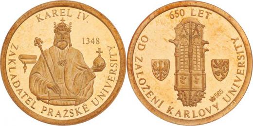 650 let Karlovy university 1998 - císař Karel čelně, nápis a opis / arkýř Karolina, znaky, opis, Nesign., Au585, 20mm, 3.502g, etue, certifikát č.40, skvrnky