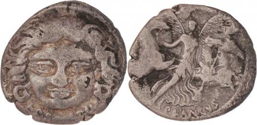 AR Denár, Hlava Medusy čelně, nápis "L.PLAVTIVS."/ letící Aurora s koňmi na uzdě "PLANCVS.", Alb.1409, Crawford.453/1a, Seaby.Plautia.14, exc., patina