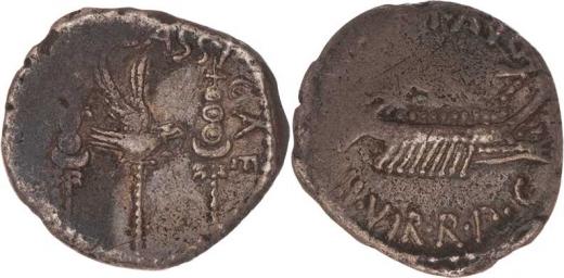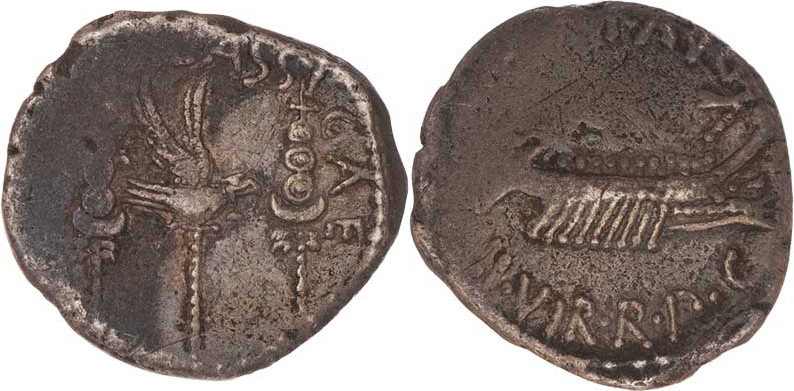 AR Denár, orel mezi standartami, "LEG.XVI.CLASSICAE." / galéra a opis "ANT.AVG.III.VIR.R.P.C.", Alb.1711, Crawford.544/10, nedor., nepravidelný okraj, patina