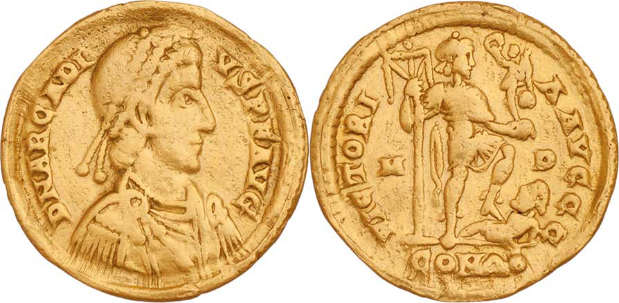 Solidus, Rv:"VICTORIA.AVGGG.", císař stojící nad zajatcem, S.4120, RIC.35b - Mediolanum - ražba z let 394 - 395, 4.348g, mírně kor., mírně hlazený R!