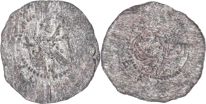 Denár, Ca.623, F.XVIII/13 (1718) - v reversu tečka mezi postavami, v aversu dvě tečky nad koleny sedící postavy, 0.718g, mírně exc., opisy téměř nevyr. R!