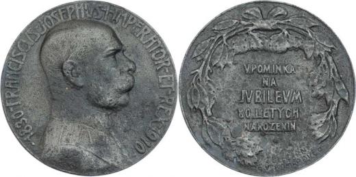 Železárny Komárov - upomínka na 80.narozeniny 1910 - poprsí zprava, opis / nápis ve věnci z vavřínu a dubu, patinované lité železo 60 mm