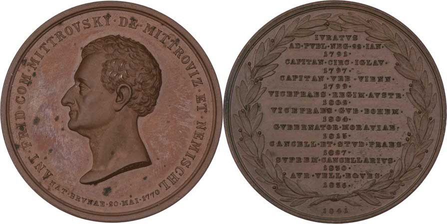 AE životopisná medaile (1815 morav. gubernátor) 1841 - hlava zleva, opis / 19-řádk. latin. nápis ve věnci, Sign.I.Schön, 50mm, BPM.283, Don.3607, skvrnky, pat.