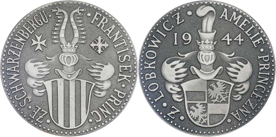 Weyr a Špánek - svatební jeton 1944 (novoražba 2003) - znak s přilbicí a klenotem, opis / znak s přilbicí a klenotem, opis, Nepunc., patinované Ag 24mm, 7.376g