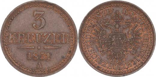 3 Krejcar 1851 A, 16.457g, dr.hr., pěkná patina, téměř