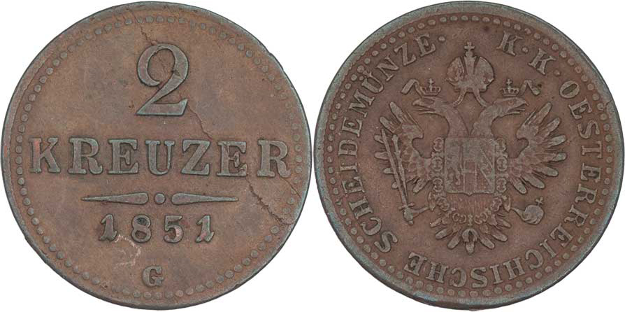2 Krejcar 1851 G, 10.660g, vada materiálu, dr.hr., dr.vady mater., pěkná patina R!