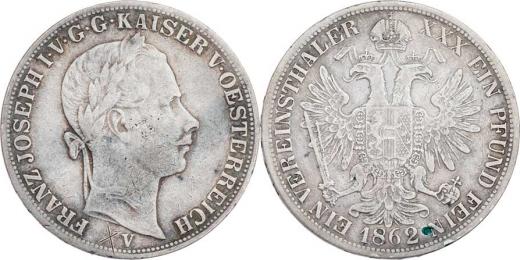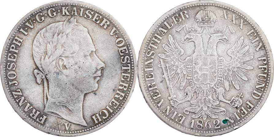 Tolar spolkový 1862 V, 18.324g, dr.hr., rysky, patina, grafitti "x", Chaurova značka R!