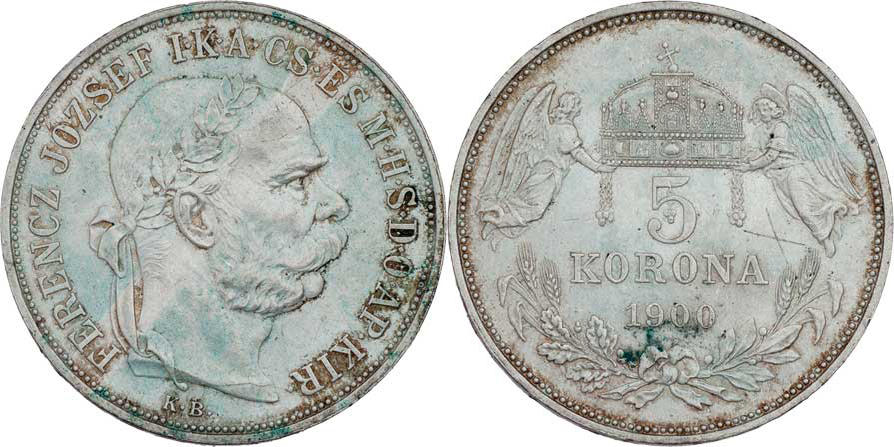 5 Koruna 1900 KB, 24.020g, nep.hr., nep.rysky, grafitti "x", patina, téměř