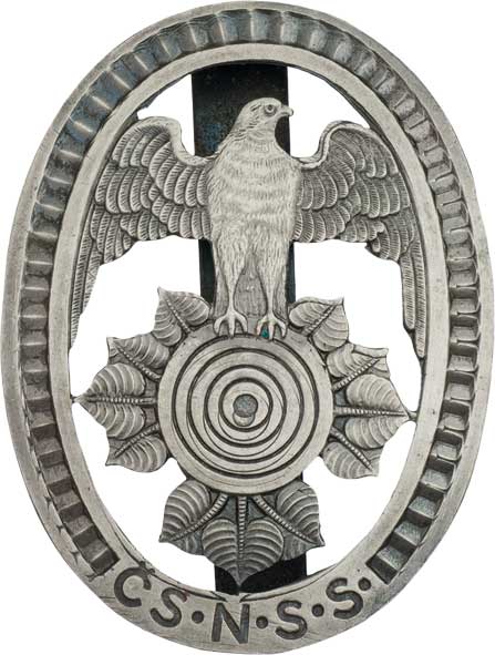 ČS.N.S.S. (Československý národní svaz střelecký) - opasková spona, Nesign., postříbřený prořezávaný bronz 46x62 mm, pěkná patina R!