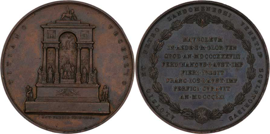 Dokončení Ticianovy hrobky v Benátkách 1852 - pomník, opis / 8-řádkový nápis ve vavřínovém věnci, opis, Sign., měď 60mm, 113.570g, dr.hr., dr.rysky, patina