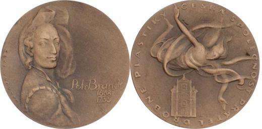 ČSPDP - Petr Brandl (1668 - 1735) 1985 - stylizovaný portrét mírně zprava, 3-řádk. nápis / letící múza nad průčelím kostela, opis, Sign., patinovaný bronz 70 mm
