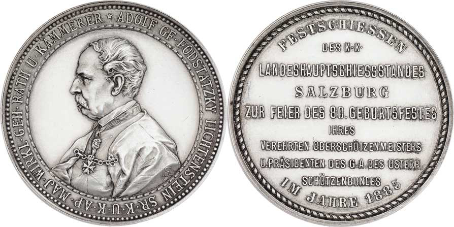 A.Podstatzky-Lichtenstein - střelby v Salzburgu 1885 - poprsí zleva, opis / 10-řádkový nápis, Sign., Nepunc., Ag 39mm, 24.442g, H.7544, nep.rysky, patina