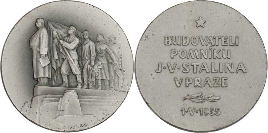 Praha - Budovateli pomníku J.V.Stalina 1.5.1955 - pohled na pomník zprava/ hvězdička, vavřínová snítka, nápis, Sign., patinované Ag987, 60mm, 97.144g R!