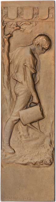 Zahradník - jednostranná ražená plaketa b.l. (1898) - kmen stromu a muž zalévající konví záhon, Sign., patinovaný bronz 28x100 mm, MZČ.200/7