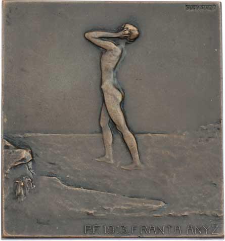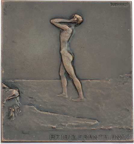 Novoročenka Anýž PF 1913 - ženský akt zleva, nápis, Sign., patin. jednostr. bronz 61x65 mm, Kr.3, nep.hr., nep.rysky, téměř