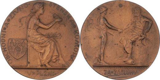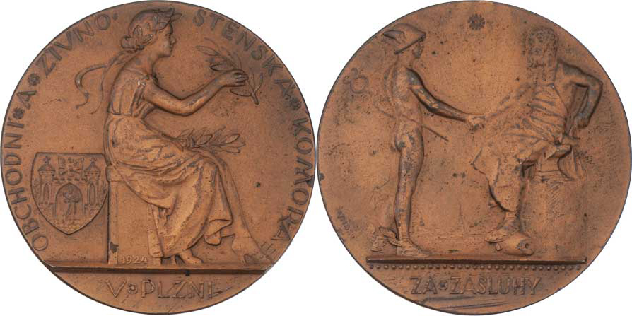 Obchodní a živn.komora v Plzni - Za zásluhy 1924 - Merkur a Vulkán, nápis / sedící žena, znak, písmo, poměděné železo 50 mm, 60.800g, patrně unikát RRRR!