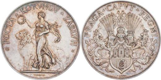 Braun a Mauder - Záslužná medaile města Prahy 1891 - Čechie se lvem, opis / znak Prahy a opis, Sign., Punc., Ag 60mm, 88.434g, ŠFP.7a (uděleno 64ks), rysky