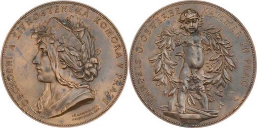 Myslbek - Obchodní a živnost. komora v Praze b.l. - hlava Čechie zleva, opis / stojící putti s věncem, opis, Sign., zlac.bronz 56 mm, ŠFP.8c (uděleno 49ks)