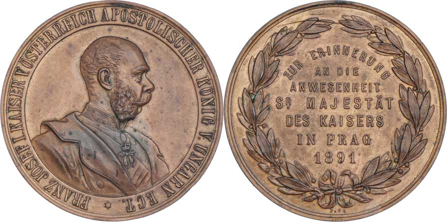 Christlbauer - návštěva Fr.Josefa v Praze - poprsí zprava, něm.opis / 7-řádk.něm.nápis ve věnci, Sign., zlac.mosaz 54 mm, ŠFP.85a, nep.vada raz., hr., lakov.