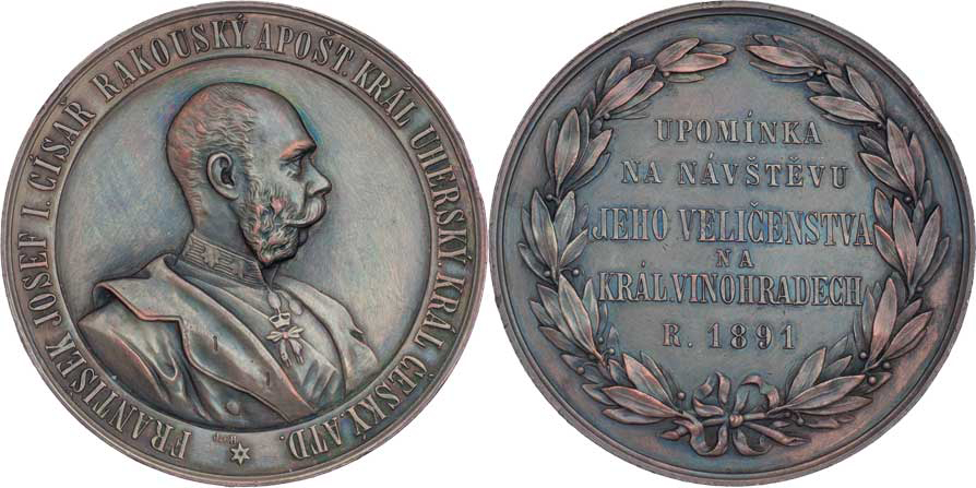 Christlbauer - návštěva císaře na Král. Vinohradech - poprsí zprava, český opis / 6-řádkový český nápis ve věnci, Sign., poměděný bronz 54 mm, ŠFP.86d, hrany