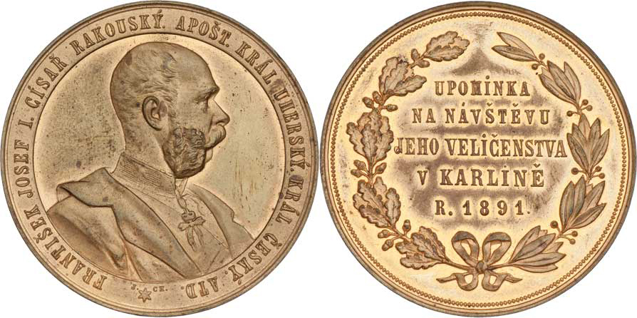 Christlbauer - návštěva Fr.Josefa v Karlíně - poprsí zprava, český opis / 5-řádkový český nápis ve věnci, zlacená mosaz 43 mm, ŠFP.88b, patina, téměř