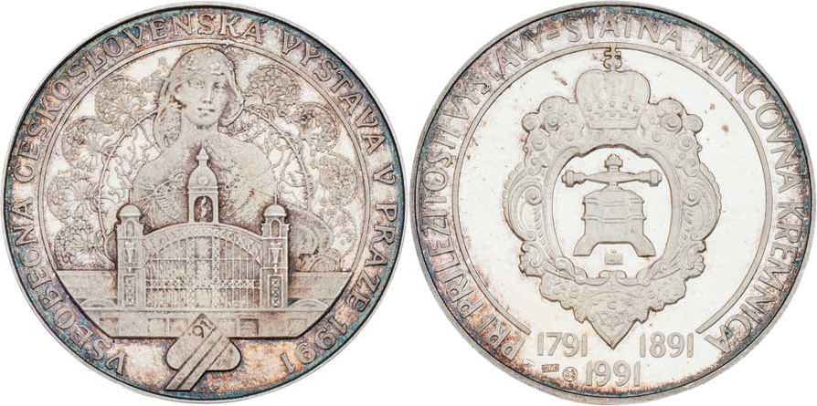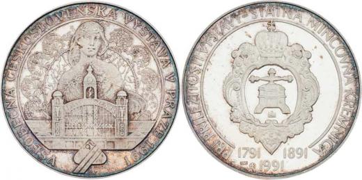 Medaile mincovny v Kremnici 1991 - Průmyslový palác, dívka, krajkový motiv a opis / emblém, opis, Sign.DZ (Zobek), Ag900, 39.404g, čísl.446, patina