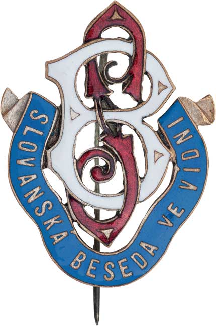 Vídeň b.l.- Slovanská beseda - monogram a český opis, Nesign., zlacený a smaltovaný bronz 31x41 mm se zavíracím špendlíkem R!