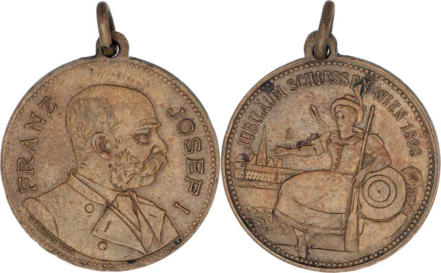Vídeň 1898 - jubilejní střelby - Fr.Josef I. zprava, opis / žena s terčem a puškou, město, opis, Sign. Pittner, mosaz 29mm s původním ouškem, dr.hr., škr.