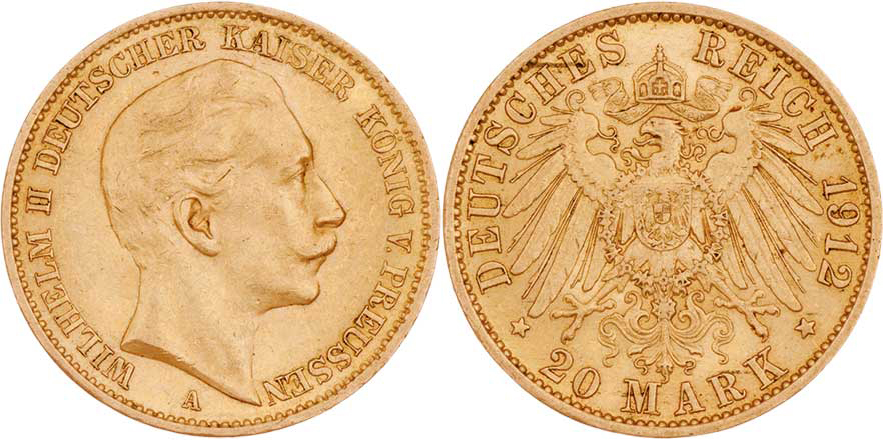 20 Marka 1912 A, KM.521 (Au900), 7.966g, nep.hr., nep.rysky, pěkná patina, téměř